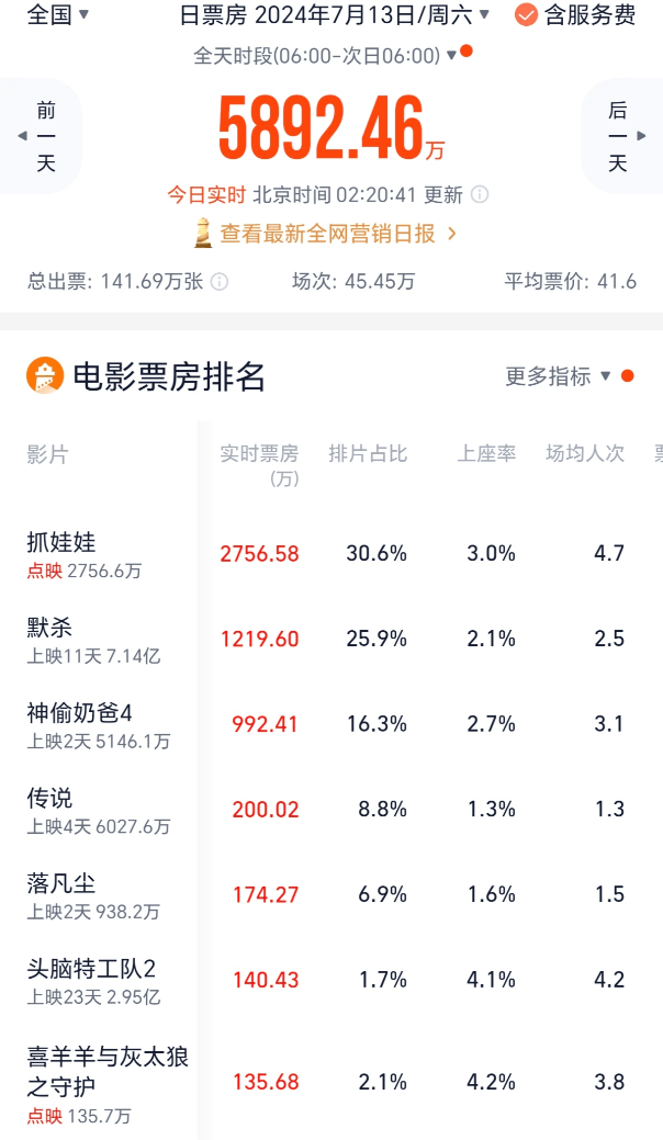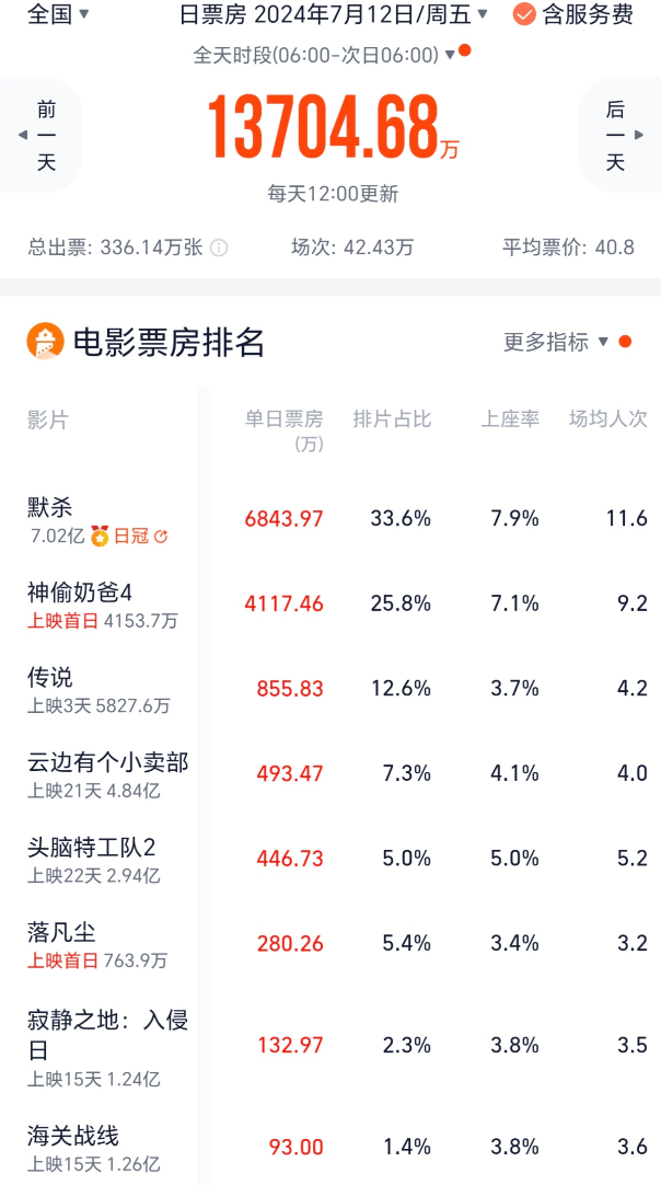 7月12日上映了两部动画新片。其中,进口动画《神偷奶爸4》首日排片25.8%,收票房4117万元,上座率仅次于《默杀》。国产动画《落凡尘》很弱,首日排片5.4%,收票房280万元,上座率垫底。