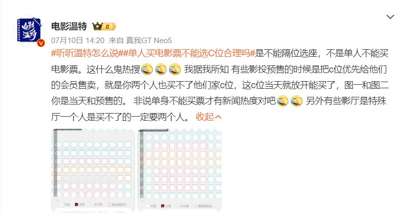 电影行业观察自媒体人温特表示对“单人买电影票不能选C位的热搜”感到纳闷。