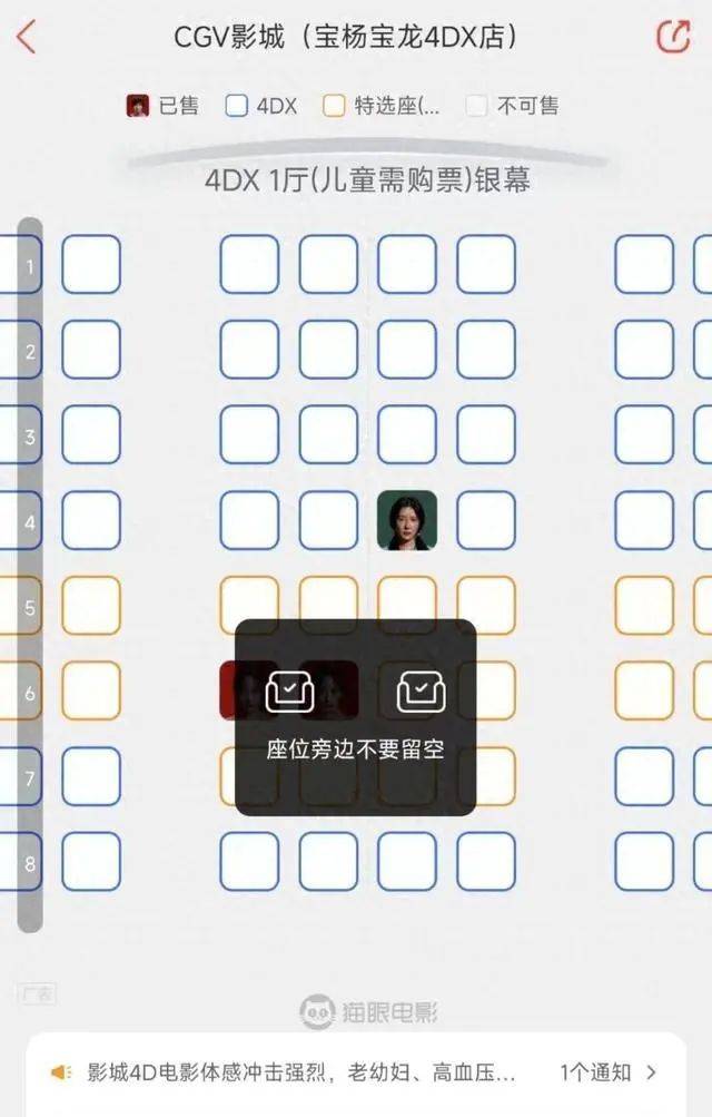 本次上热搜的电影厅是4DX厅,全国其实就几十个,而该类型的电影厅座位为四个一组,假设一组座位从左至右为1、2、3、4,由于两边不留空的购票原则限制,只能优先买1或者4。即便是两个人购票,也只能选择1 2、1 4或3 4的组合,无法直接购买2 3核心位置组合。