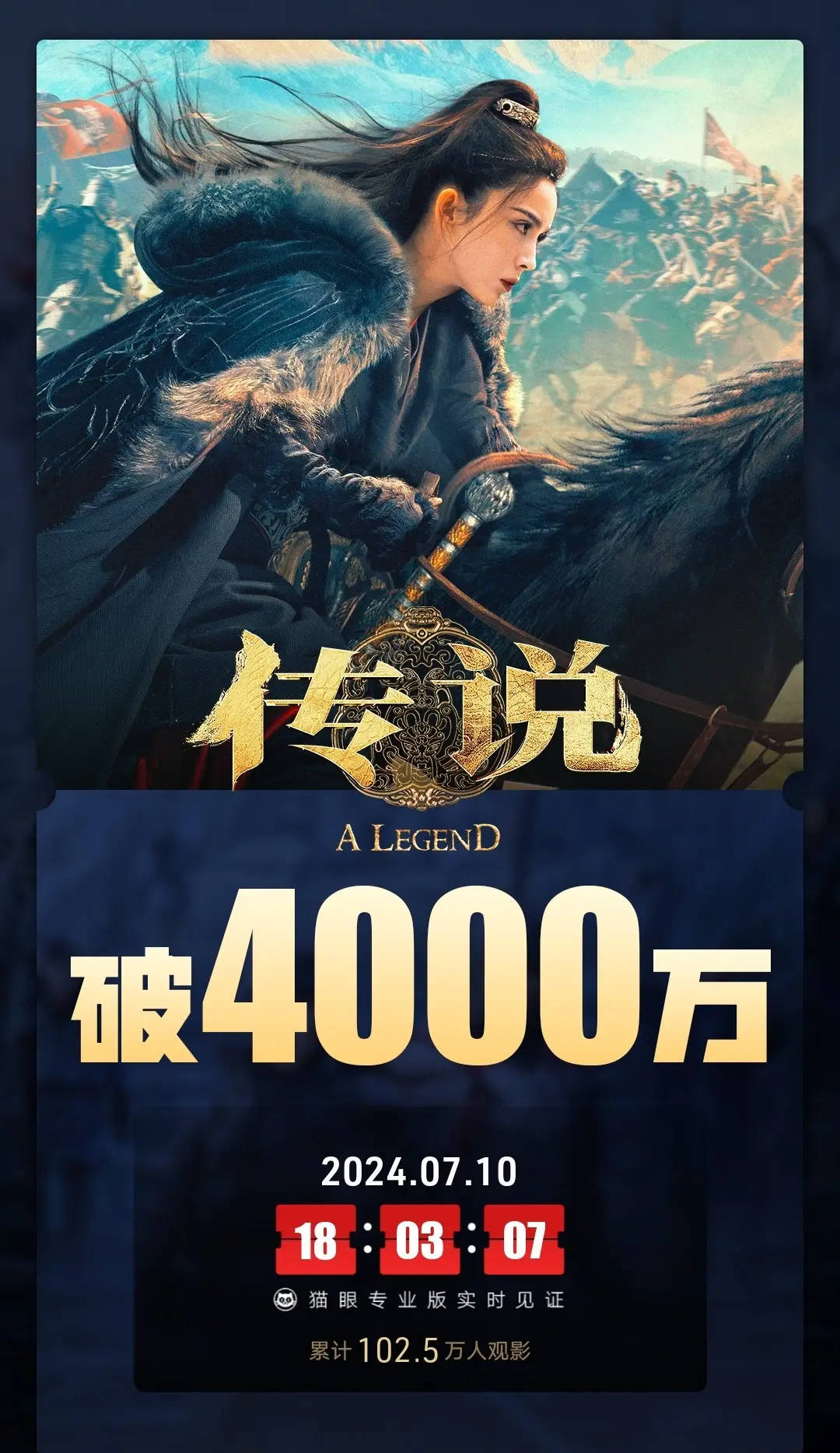 搜狐娱乐讯 据猫眼专业版数据,截至7月10日18时3分,电影《传说》上映首日总票房破4000万!该影片由唐季礼编剧并执导,成龙、张艺兴、娜扎、李治廷领衔主演,李晨特别主演,彭小苒特邀主演,窦骁友情出演,郑业成特别出演。