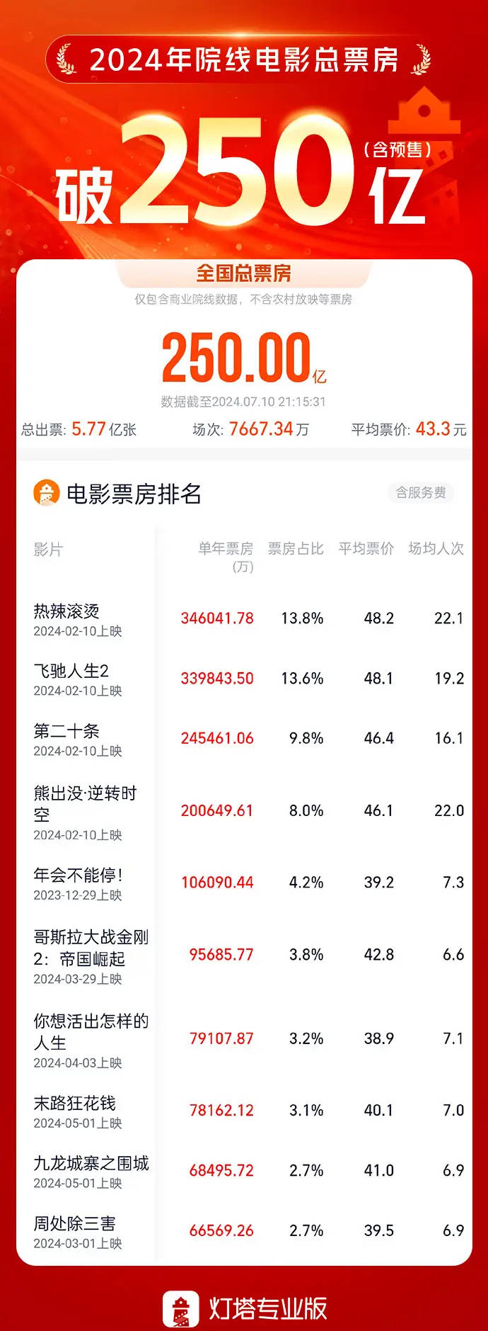 搜狐娱乐讯 据灯塔专业版数据,截至7月10日21时15分,2024年度院线电影大盘票房(含预售)突破250亿!