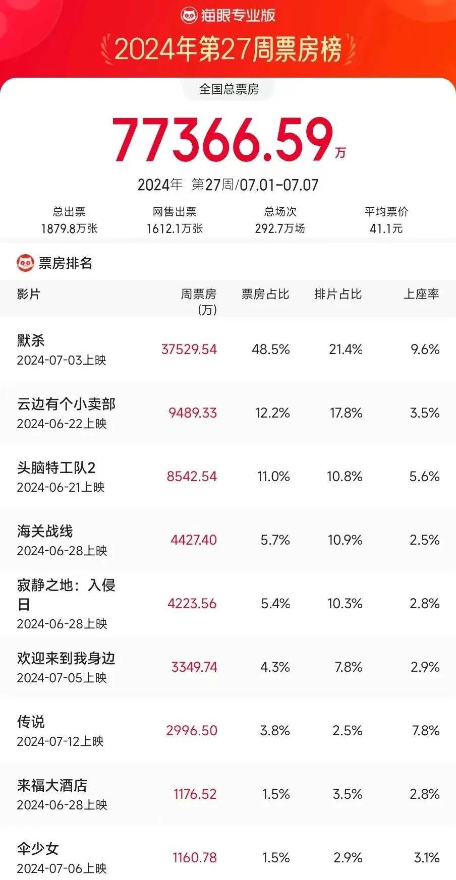 上周影市,大尺度犯罪片《默杀》异军突起,暑期档热度总算有所起色。07.01-07.07一周内地票房报收7.73亿,相较前一周的5.97亿增长29.4%,起码是有了点“这才是暑期档”的意思。