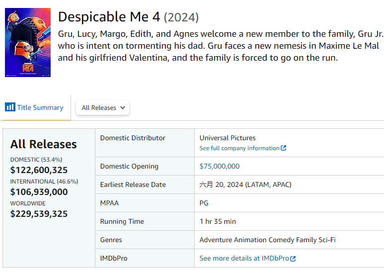 搜狐娱乐讯 照明娱乐动画“神偷奶爸”系列新作《神偷奶爸4》于7月3日登陆北美院线,首周末3天票房粗报7500万美元,加上7月4日独立日假期,首周5天累计1.226亿美元。为该系列北美开画成绩第二。