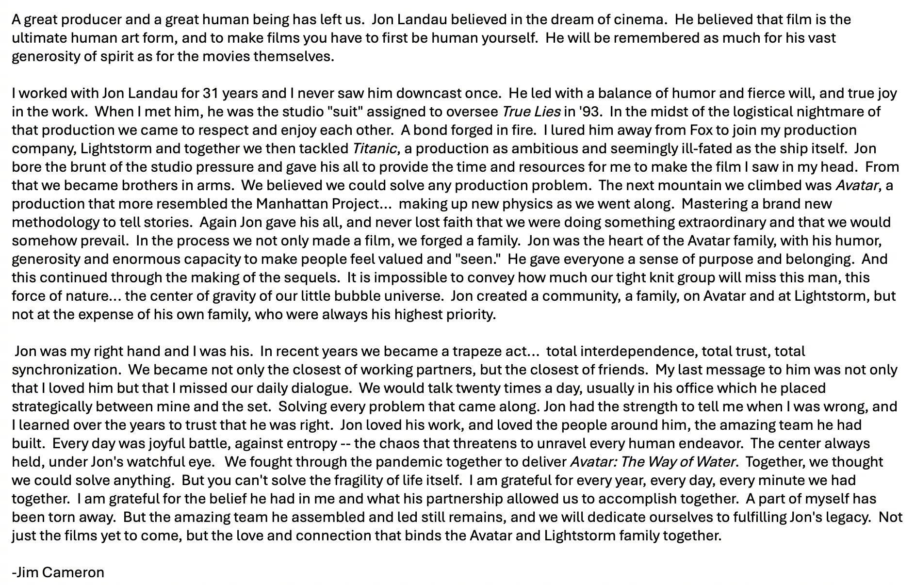 我和乔恩·兰道共事了31年,我从未见过他沮丧过。他以幽默和坚定的意志以及工作中的真正乐趣来带领大家。当我初见他时,他是1993年被指派来监督《真实的谎言》的工作室“职员”。在这部后期制作的噩梦中,我们开始互相尊重并享受彼此。在烈焰中结下友情。我把他从福斯公司挖走,加入我的制作公司“光风暴”,然后我们一起制作了《泰坦尼克号》,这是一部与”泰坦尼克号“一样雄心勃勃、又看似命运多舛的作品。乔恩首当其冲地承受了工作室的压力,并竭尽全力为我提供时间和资源来制作我脑海中看到的电影。从此我们成了战友,我们相信我们可以解决任何制作问题。
