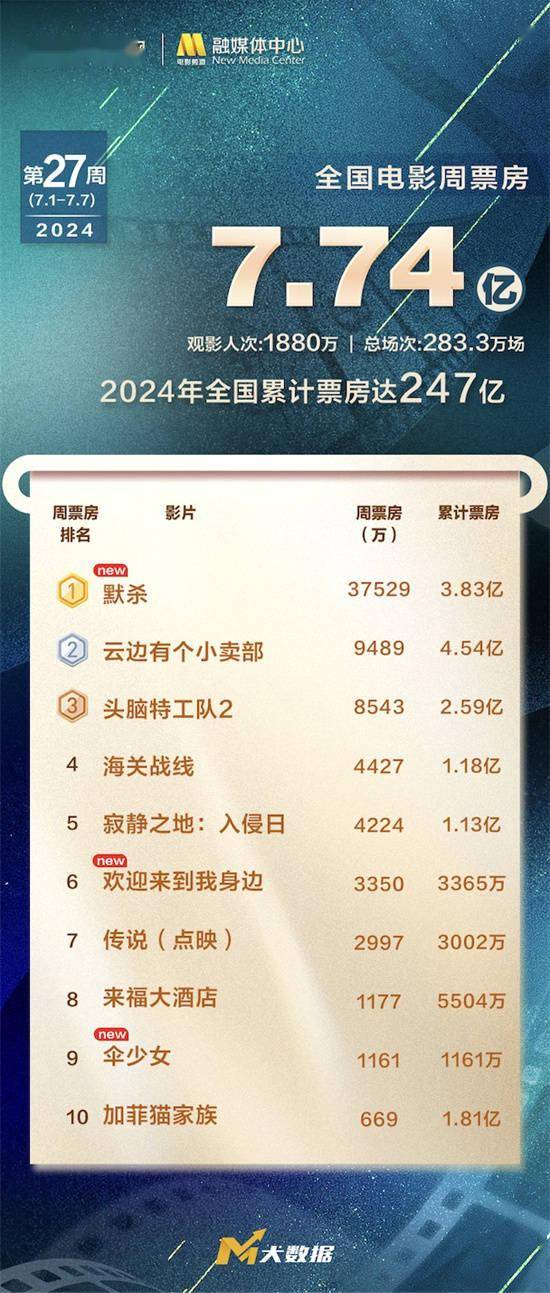 1905电影网讯2024年第27周(7.1-7.7)全国电影周票房7.74亿,观影人次达1880万,2024暑期档票房已超过30亿,全年电影票房累计247亿元。