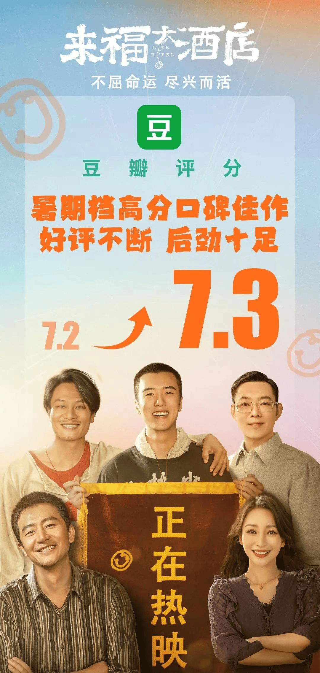 公映一周后,这部影片的豆瓣评分从7.2上升至7.3。在今年暑期档这个优质项目稀缺的档期里,《来福大酒店》的口碑上涨更显得弥足珍贵。