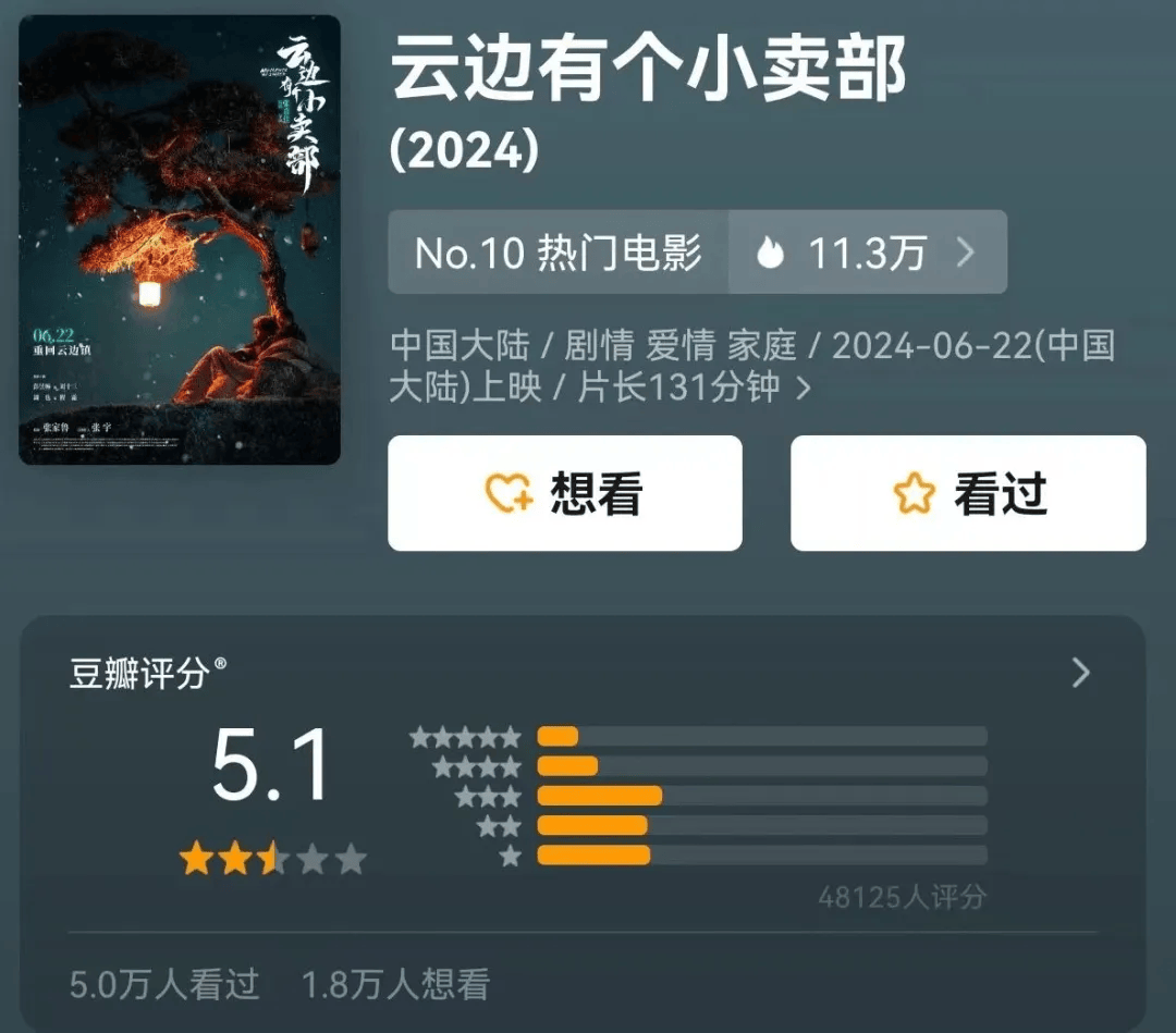 电影《云边有个小卖部》改编自张嘉佳同名小说,自6月22日上映以来,吸引不少观众走进影院。截至7月3日,票房已破4亿,但电影在豆瓣上由近5万人打出评分5.1,跌破及格线。票房好口碑烂,原作者亲自改编也没能挽回的电影口碑,再次说明了电影这一艺术形式的门槛。不懂电影叙事的作品,终究只是“门外汉”。