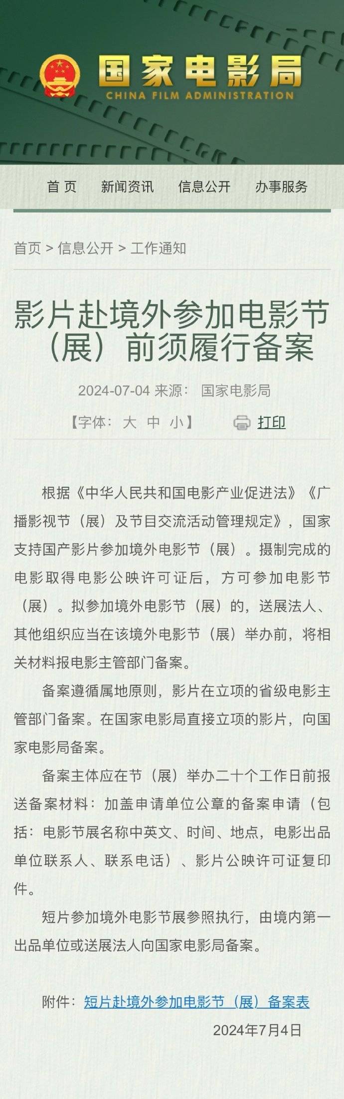 搜狐娱乐讯 7月4日,国家电影局发布最新规定,更新有关电影参加境外电影节展的履行备案:短片参加境外电影节展,境内第一出品单位或送展法人应向国家电影局备案。影片在取得电影公映许可证后,方可参加电影节(展)。