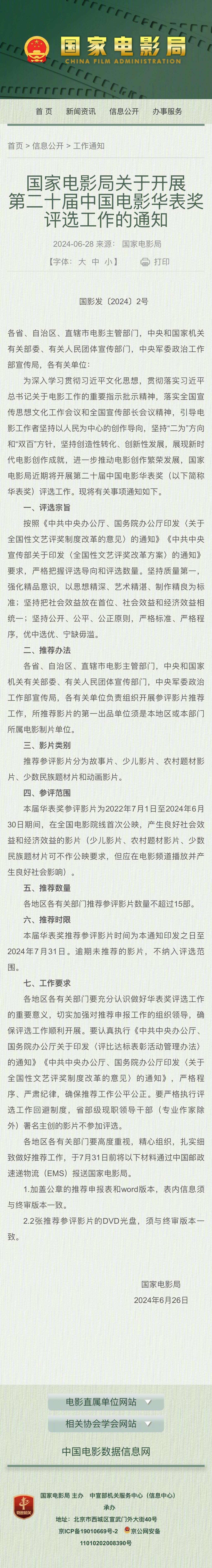 搜狐娱乐讯 国家电影局在其官网发布《国家电影局关于开展第二十届中国电影华表奖评选工作的通知》,本届华表奖参评影片为2022年7月1日至2024年6月30日期间,在全国电影院线首次公映,产生良好社会效益和经济效益的影片(少儿影片、农村题材影片、少数民族题材片可不作公映要求,但应在电影频道播放并产生良好社会影响)。