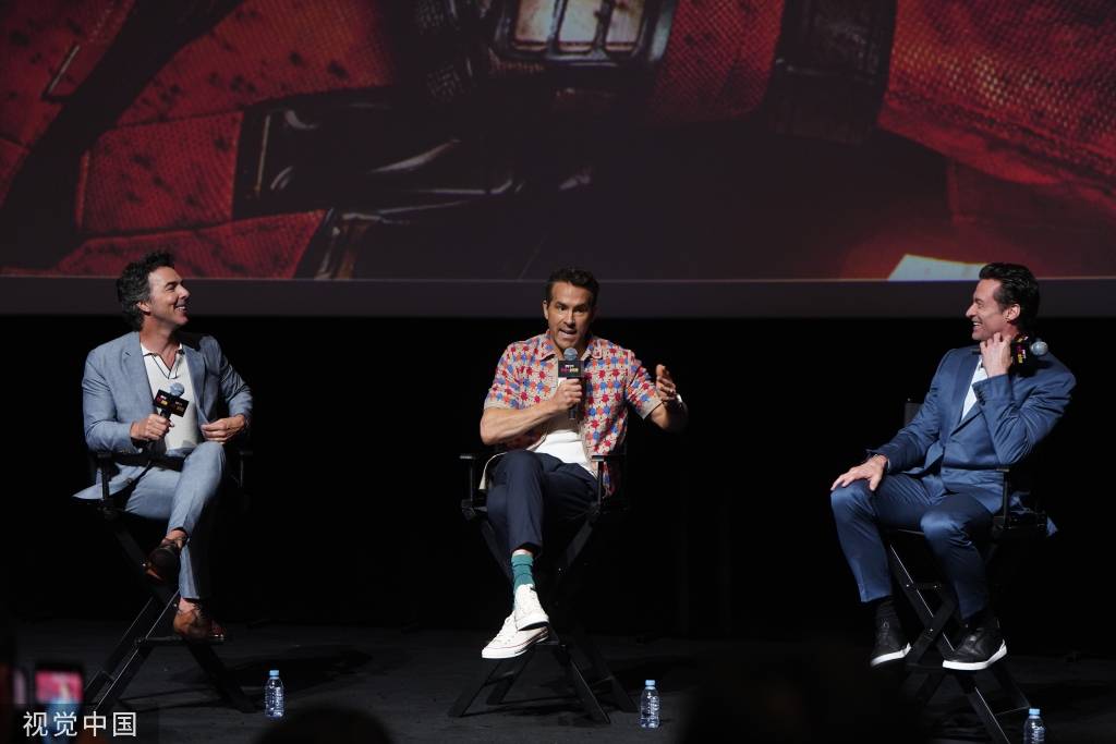 搜狐娱乐讯 7月26日内地北美同步上映的漫威新片《死侍与金刚狼》在上海举办主创见面会。导演肖恩·利维、“死侍”瑞安·雷诺兹、“金刚狼”休·杰克曼亮相。“休叔”表示回来感觉很好,并用中文说“谢谢”。