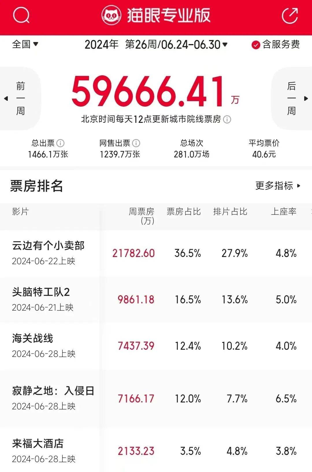 暑期档的第一个月已经收官。上周06.24-06.30内地票房报收5.96亿,相较前一周的4.89亿增长21.9%,虽然不算太冷,但和去年06.26-07.02一周21.71亿的成绩比起来,实在差了太多;6月整月票房(22.30亿),也仅相当于去年6月票房(41.33亿)的一半左右,今年暑期档迄今为止的表现可见一斑。