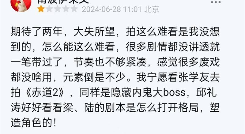 某位观众表示,自己像看了一部“上世纪八九十年代的老套美国动作电影”,从剧情到人物关系再到动作场面,都非常老套。