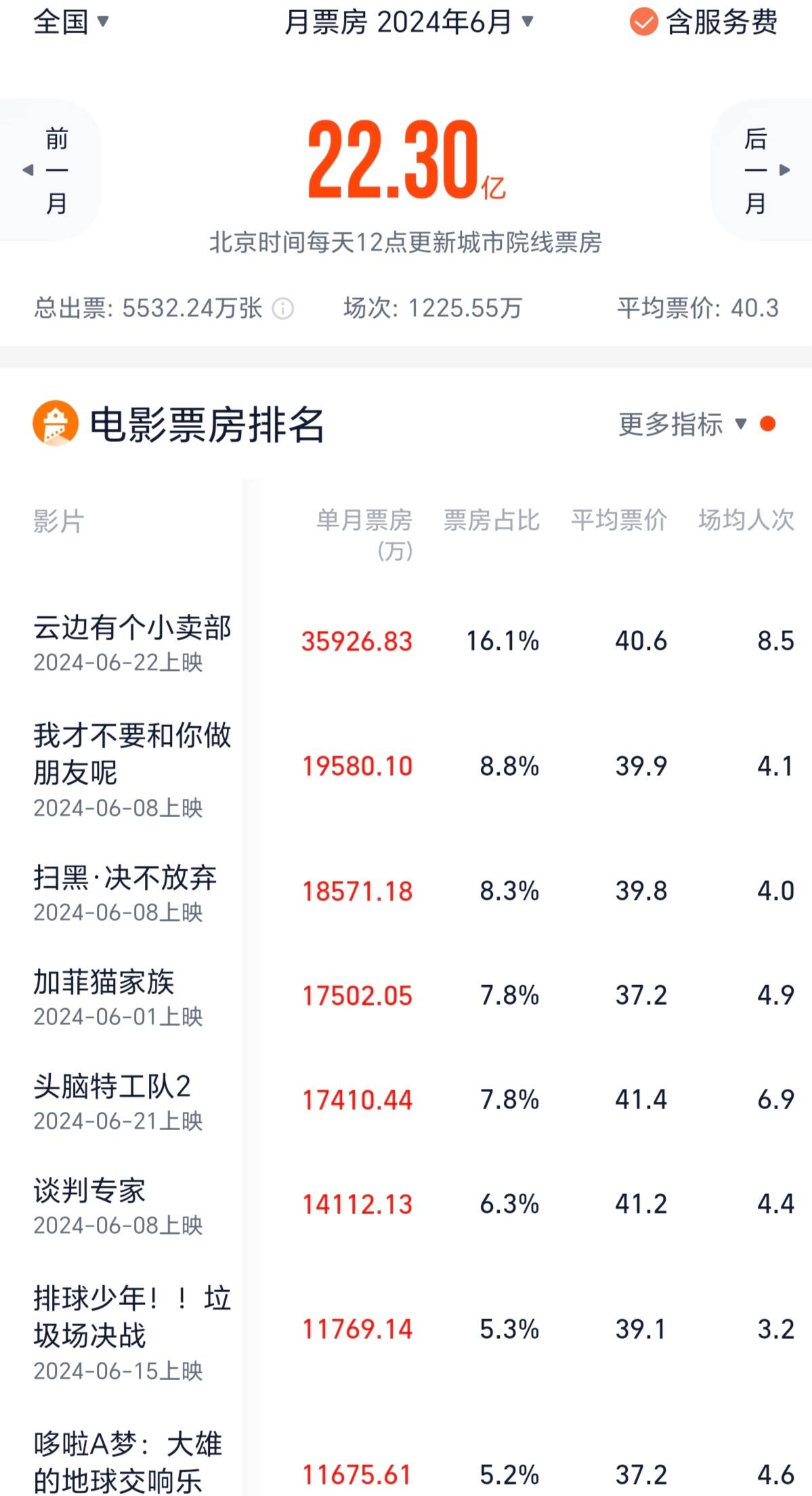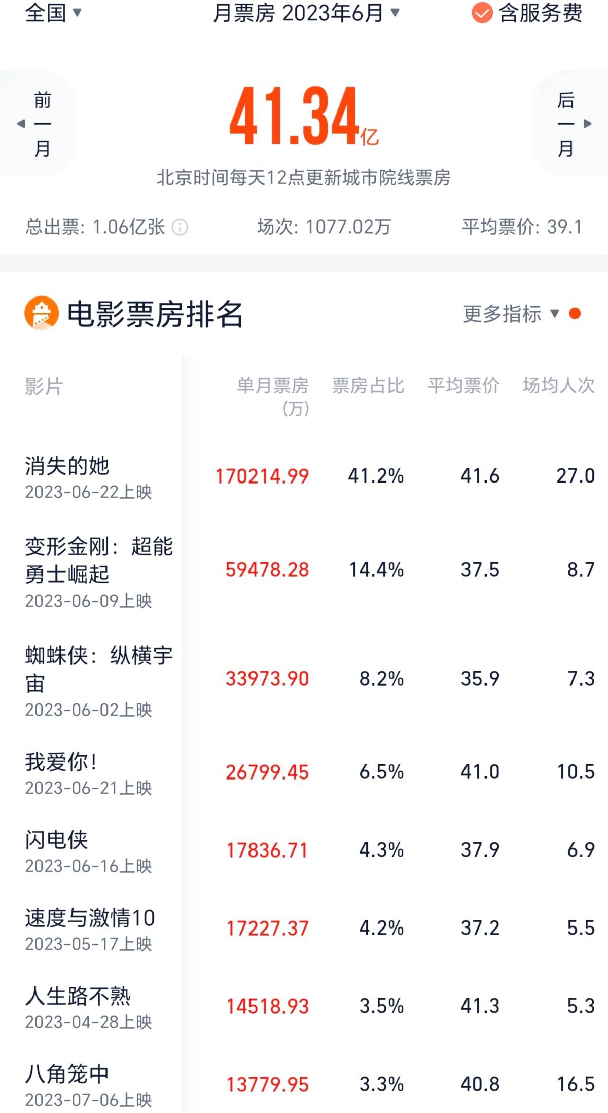 去年六月一部《消失的她》卖了17亿元,两部进口片《变形金刚:超能勇士崛起》和《蜘蛛侠:纵横宇宙》各卖了5.95亿元、3.4亿元。而今年六月最卖座的电影是《云边有个小卖部》,当月累计票房3.6亿元。