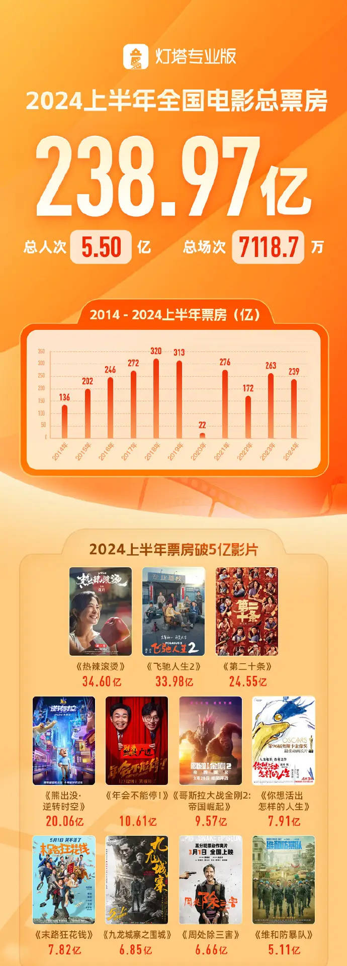 搜狐娱乐讯 6月30日,据灯塔专业版数据,截至6月30日21时,2024年上半年(1-6月)全国电影总票房粗报238.97亿元,总观影人次5.50亿,总放映场次7118.7万场,影片《热辣滚烫》《飞驰人生2》《第二十条》成为上半年票房前三名。