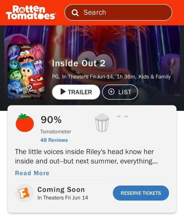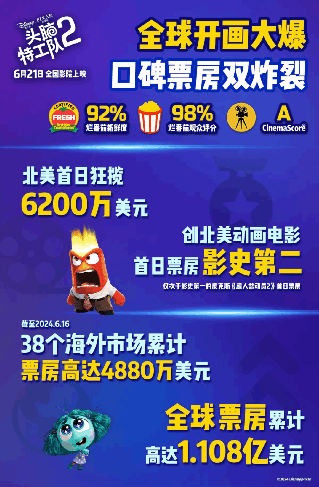 在烂番茄双90%以上的强劲口碑加持下,《头脑特工队2》已经超越了《沙丘2》成为今年目前为止全球票房最高的电影,也是今年首部能够加盟“10亿俱乐部”的电影,彻底洗刷迪士尼直送Disney 的负面效应,宣告皮克斯在大银幕上的王者归来。
