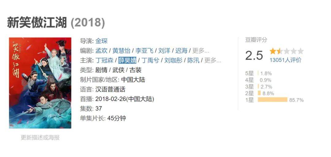 一方面,原著粉很难找寻到往日情怀,不愿买账;另一方面,新观众只是看个热闹,难以理解金庸作品所传递的一种人情味、一种历史沧桑感、一种诗意、一种深刻的人生哲理。