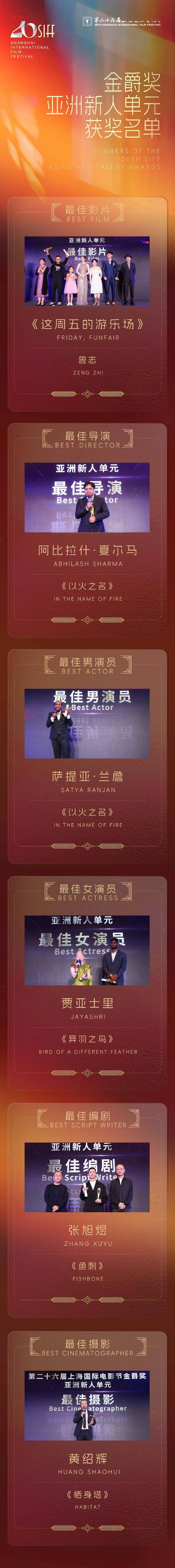 中国电影捧走“最佳影片”奖;凭借印度电影获颁“最佳导演”的同时,萨提亚·兰詹也凭借这部电影摘得“最佳男演员”殊荣;“最佳女演员”同样颁给了来自印度的贾亚士里,“最佳编剧”和“最佳摄影”分别花落中国青年影人和黄绍辉。