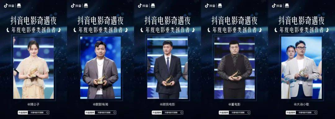 而另一边,在过去一年抖音平台上创作了许多出圈作品的@顾我电影 、@婧公子、 @董电影、 @默默有闻、@大诗小歌 等创作者们,也在这样一个特殊的时刻走上台前,接受了属于自己的年度电影创作者荣誉。