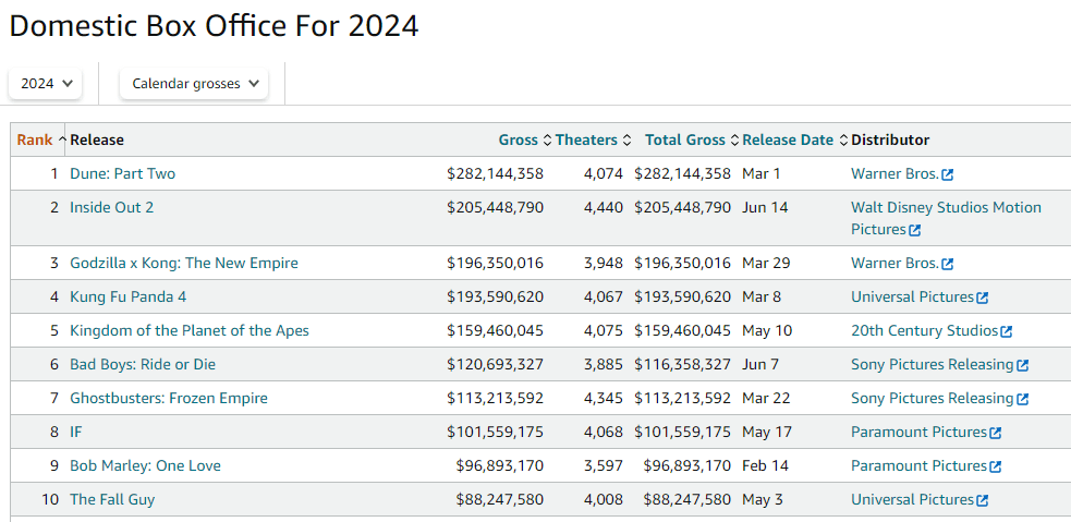 全球累计票房3.8亿美元,暂居今年全球票房榜第四位,前三位分别为《沙丘2》(7.11亿),《哥斯拉大战金刚2》(5.67亿),《功夫熊猫4》(5.43亿)。