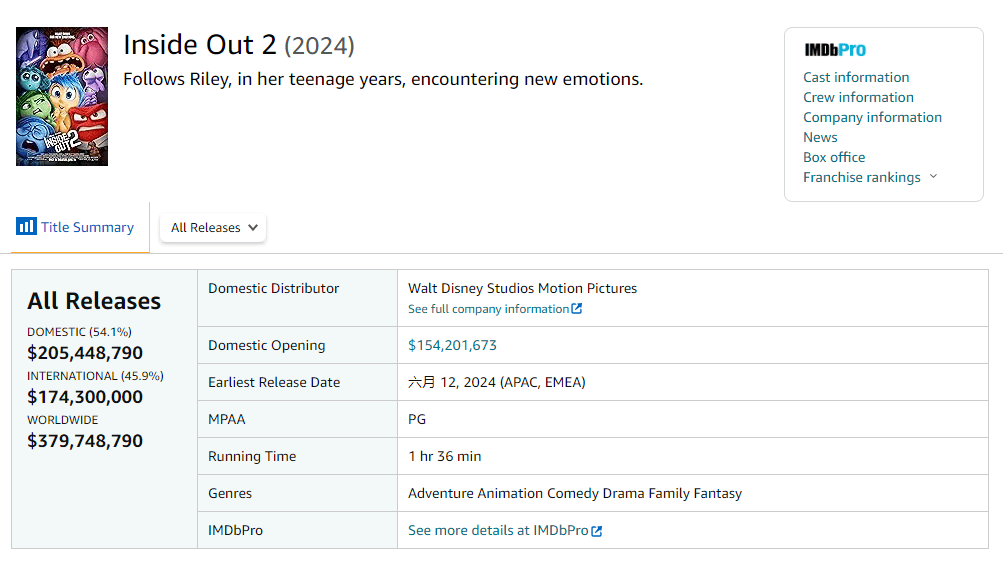 搜狐娱乐讯 6月14日(上周五)北美上映的皮克斯动画电影续集《头脑特工队2》首周末票房远超预期,斩获1.55亿美元,上映5天票房破2亿美元,目前累计2.05亿,仅次于《沙丘2》(2.82亿),暂居今年北美票房亚军。