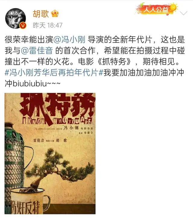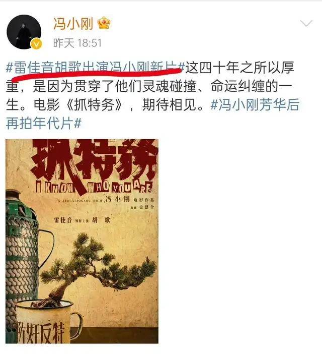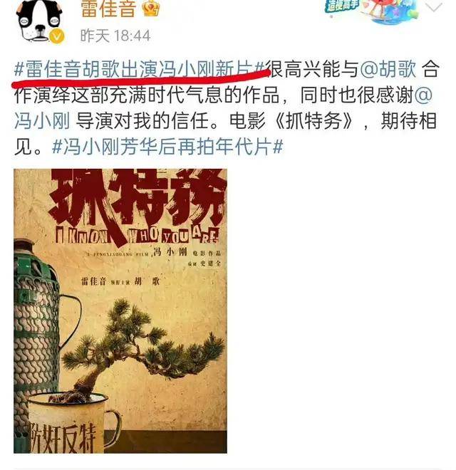 电影的海报当中,大家看到领衔主演:雷佳音、胡歌,分别在一左一右。自古以来,就是以左为尊,在文字上面的排序,雷佳音也是排在胡歌前面的。虽然粉丝嘴上说着胡歌不在乎番位,但是胡歌在发这条微博官宣的时候就没有带“雷佳音胡歌共同主演冯小刚新片”,这个话题,反而把自己放在了前面,接着@雷佳音。不同于其他二人的发微博方式,还是挺耐人寻味的。