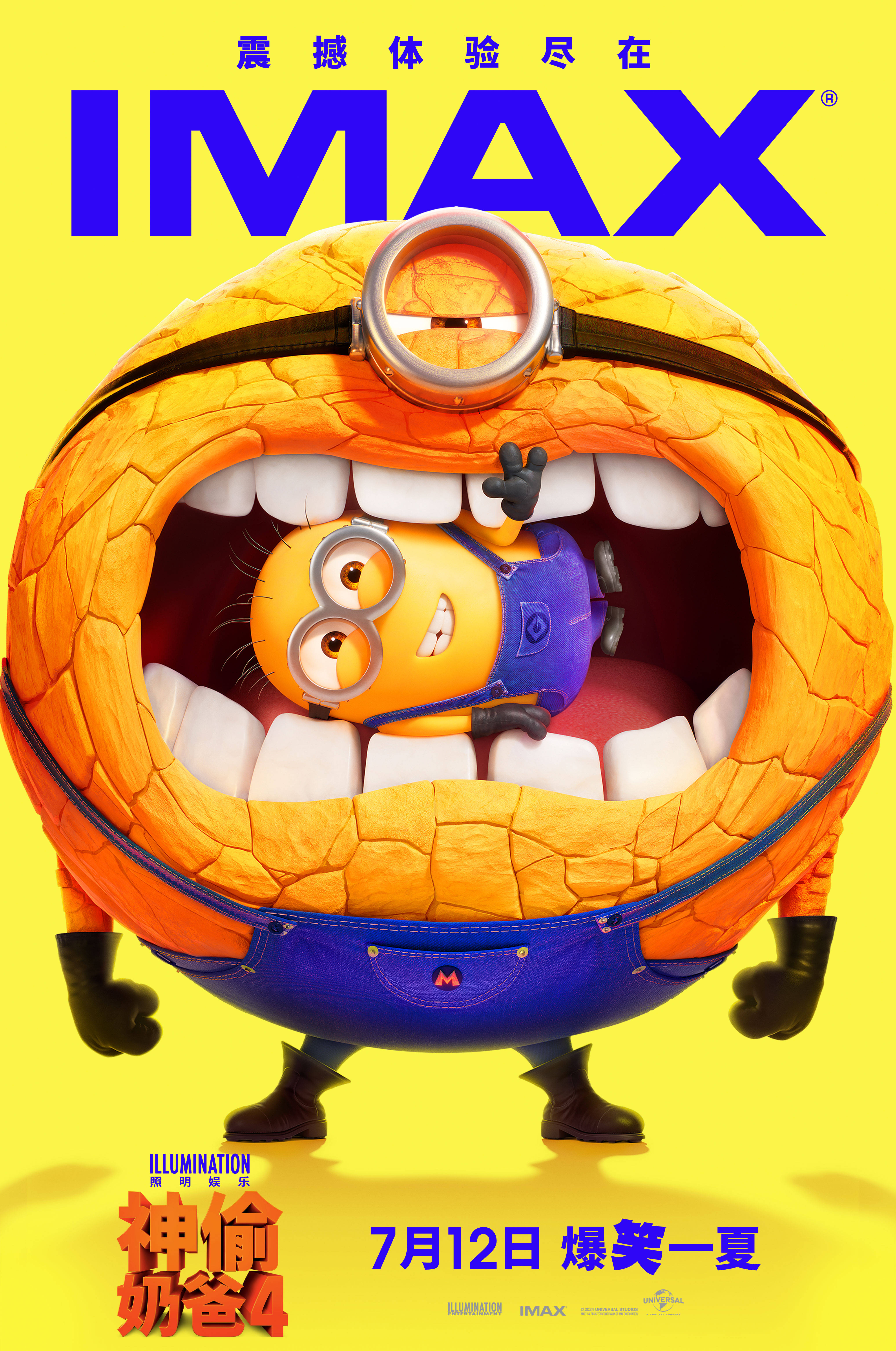 今日发布的《神偷奶爸4》IMAX海报中,超能力加持的小黄人“斯图尔特”变身“石化”的壮硕硬汉,酷劲十足,“鲍勃”则俏皮地从“斯图尔特”大嘴中探出头来和观众打招呼,笑容天真,憨萌依旧。充满喜感的海报与影片风格一脉相承,令人更加期待在IMAX的沉浸氛围中与这些老友无间欢聚,爆笑一“夏”!
