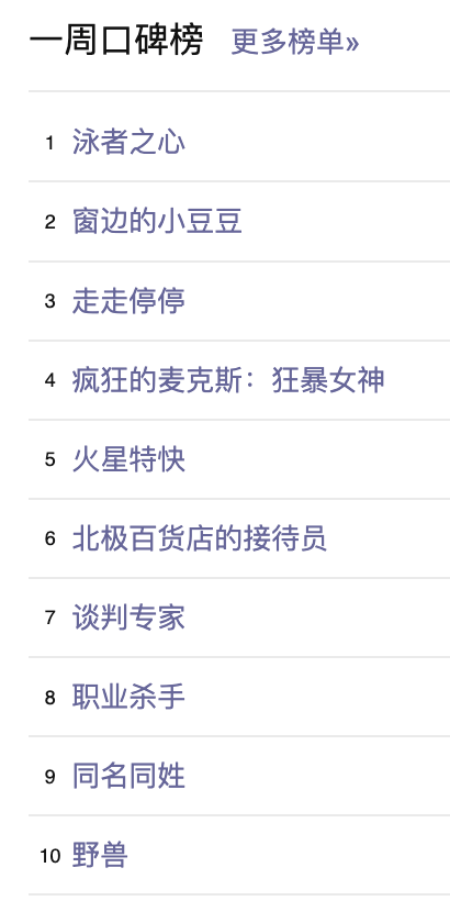 最后,还是例行附上一周豆瓣口碑榜的完整榜单: