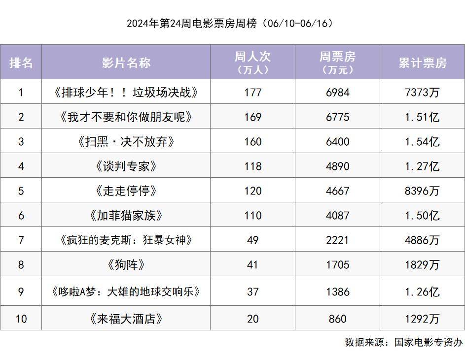 上周(2024/6/10-6/16)全国电影市场共收获票房4.57亿,较上上周有所提高,位列周票房榜前三名的影片分别为《排球少年!!垃圾场决战》《我才不要和你做朋友呢》《扫黑·决不放弃》。