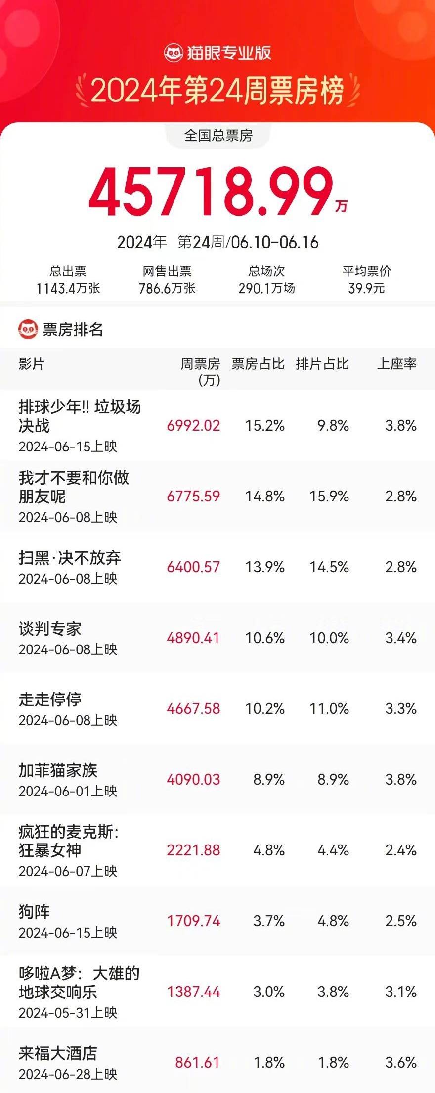 搜狐娱乐讯 据猫眼专业版数据,6.10-6.16内地一周票房报收4.57亿,较前一周4.08亿上涨12%。