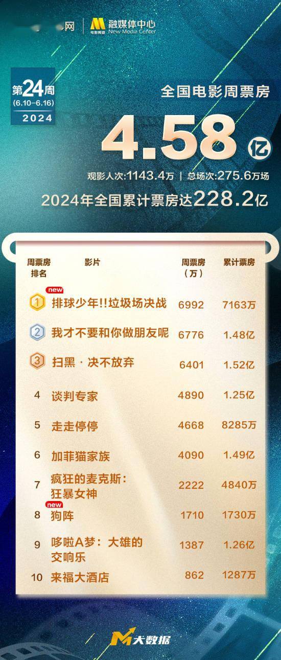 1905电影网讯2024年第24周(6.10-6.16)全国电影周票房4.58亿,观影人次超1143万,2024全年电影票房累计228.2亿元。