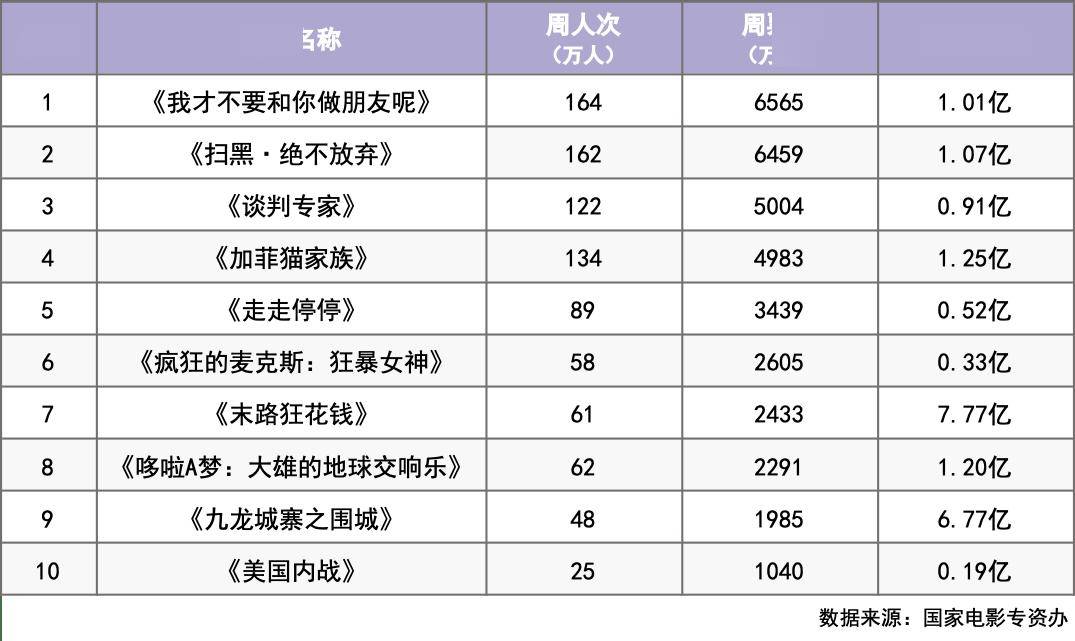 位列上周票房榜前五名的影片与端午档票房榜前五名重合。挺进票房榜前三名的影片均来自端午档首日上映的国产新片,分别是《我才不要和你做朋友呢》《扫黑·绝不放弃》《谈判专家》。