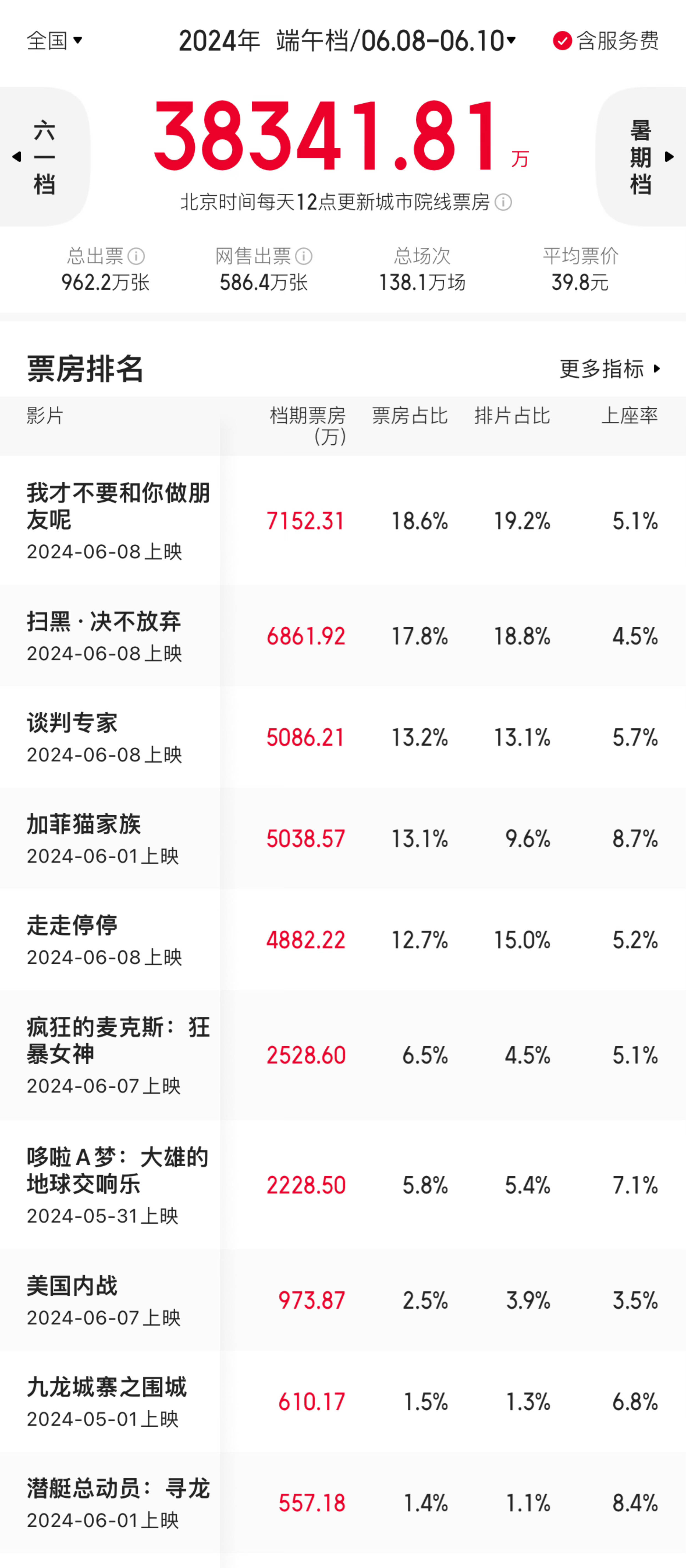 搜狐娱乐讯 2024年端午假期三天(6.8-6.10),全国电影票房分别为1.24亿元、1.42亿元、1.17亿元,累计3.83亿元,比去年《消失的她》上映的端午档9.11亿暴跌58%。创下除受疫情影响影院停业的2020年和影院营业率极低的2022年,近10年最差端午档成绩。