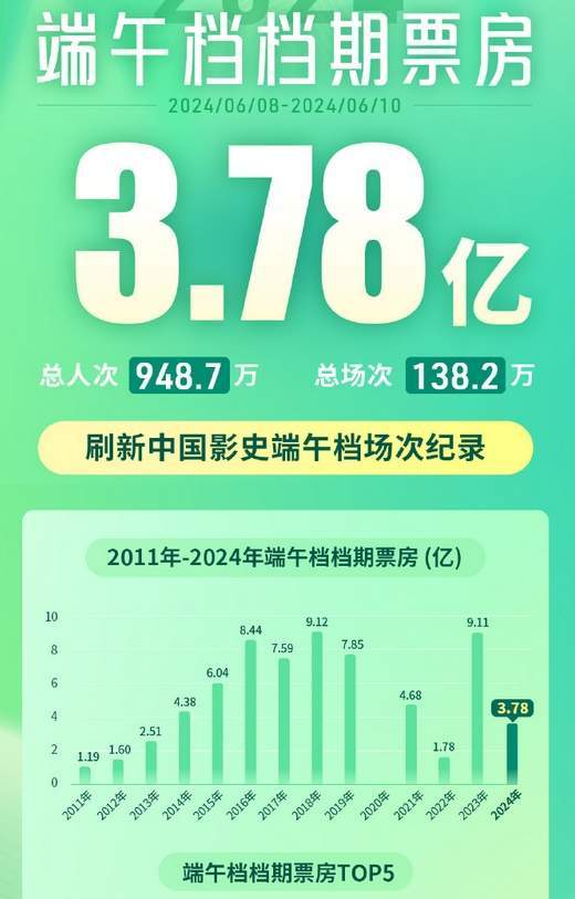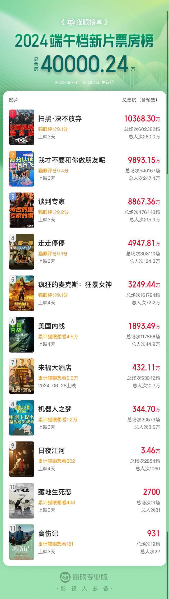 截至6月10日19时6分,2024年端午档新片(含预售)总票房已突破4亿元。电影《扫黑·决不放弃》、《我才不要和你做朋友呢》、《谈判专家》目前暂列端午档新片票房(含预售)前三位。