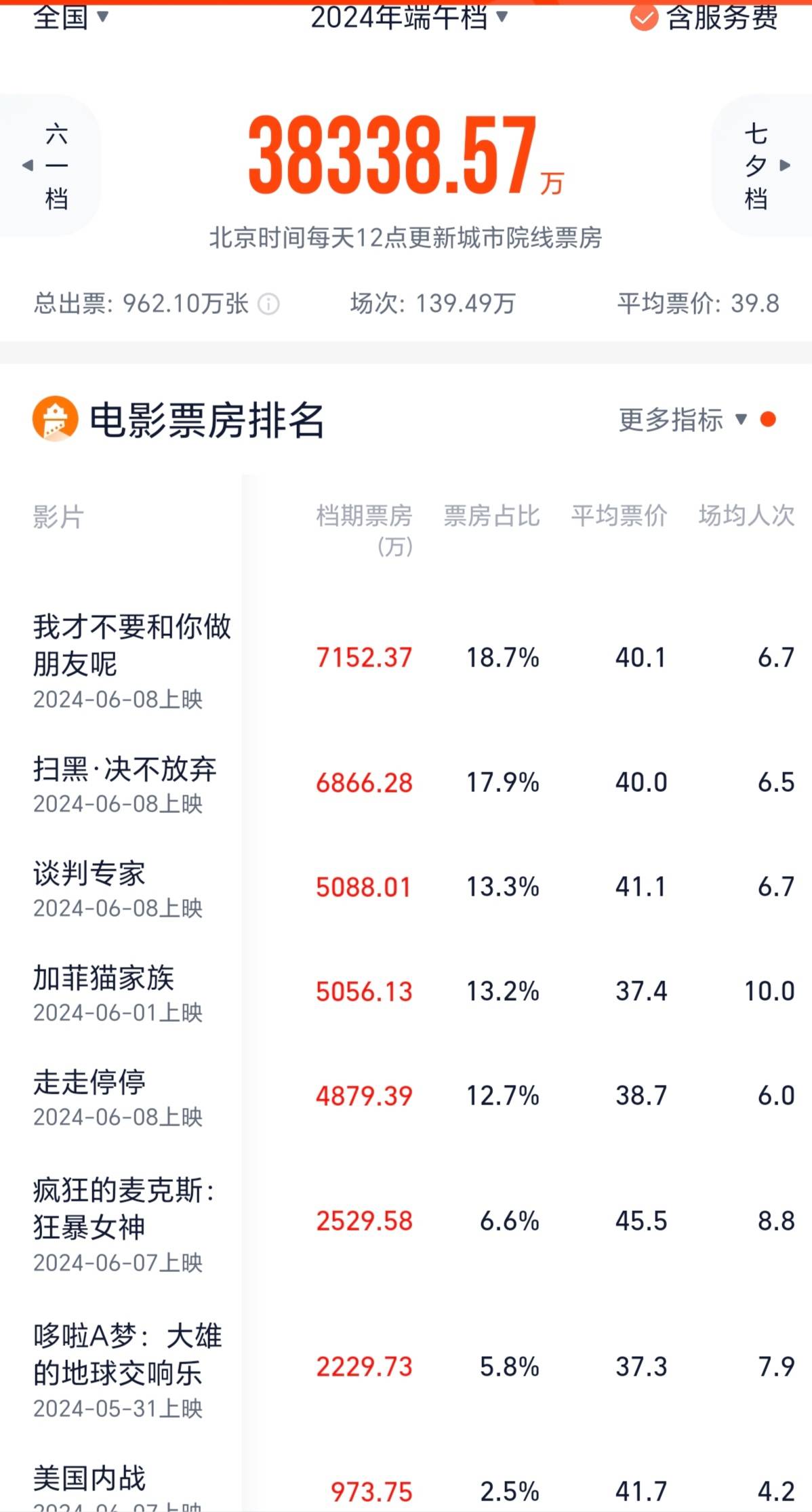 搜狐娱乐讯 (哈麦/文)2024年端午假期三天,全国电影票房分别为1.24亿元、1.42亿元、1.17亿元,累计3.83亿元,比《消失的她》上映的去年端午档下跌58%。