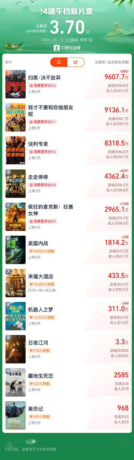 目前,电影大盘仍在持续增长中。《我才不要和你做朋友呢》能否反超《扫黑·决不放弃》?哪部影片将成为2024年端午档新片票房冠军,让我们拭目以待!