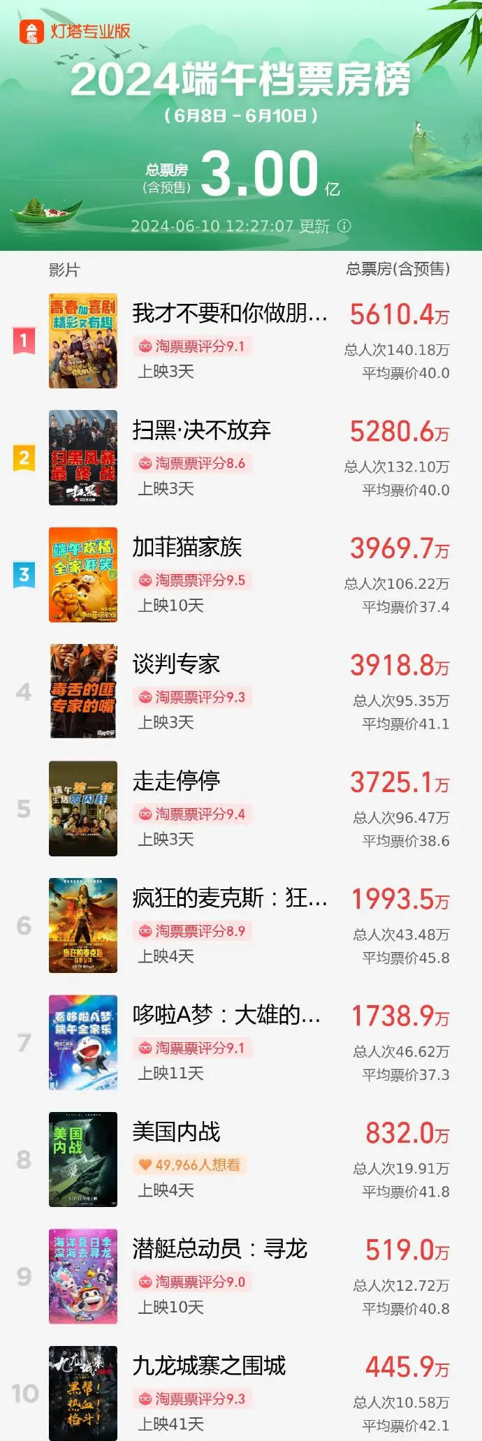 搜狐娱乐讯 据灯塔专业版,截至6月10日时12时27分,2024端午档(6月8日-6月10日)档期内票房(含预售)突破3亿!《我才不要和你做朋友呢》领跑端午档票房,《扫黑·决不放弃》《加菲猫家族》暂列档期内票房前三位。