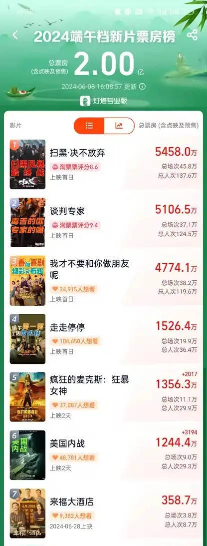 搜狐娱乐讯 6月8日,据灯塔专业版数据,截至6月8日16时08分,2024年端午档新片(含预售)总票房突破2亿大关,《扫黑·决不放弃》《谈判专家》《我才不要和你做朋友呢》分列票房榜的前三名。