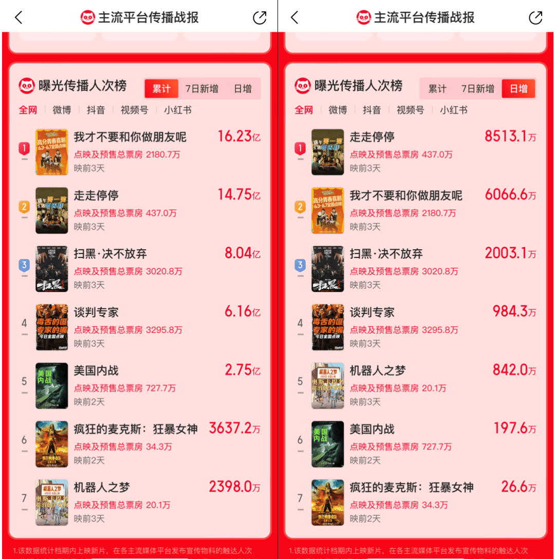 除了口碑竞争加剧外,更早寄希望于点映或许还有另一个原因,即同档期影片在宣发上并没有呈现出太大的差异化。根据猫眼释出的主流平台传播战报数据,截至目前,《我才不要和你做朋友呢》的全网累计曝光传播人次最高,达到16.23亿次,而《走走停停》的日增量最大,有后来居上的势头。