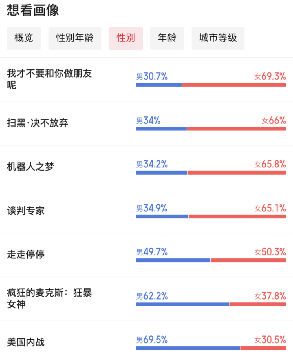 基于此,《美国内战》《疯狂的麦克斯:狂暴女神》更契合男性消费群。猫眼专业版数据显示,两部影片的男性想看用户占比都在60%以上,其中,《美国内战》的男性受众占比更是接近70%。