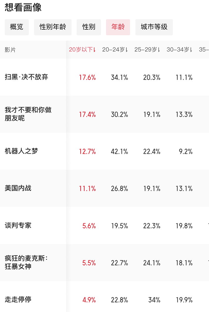 其中,青春片《我才不要和你做朋友呢》融合穿越、喜剧元素,更接近年轻市场,犯罪片《扫黑·决不放弃》除了由肖央主演外,范丞丞的加入也吸引了年轻观众的关注,而后来定档的《机器人之梦》则是档期内唯一一部动画电影,全剧没有一句台词,却治愈感颇强,猫眼专业版数据显示,三部影片的想看用户中,24岁以下的用户占比都在47%以上,尤其是《机器人之梦》,其20-24岁的想看用户占比就达到42.1%。