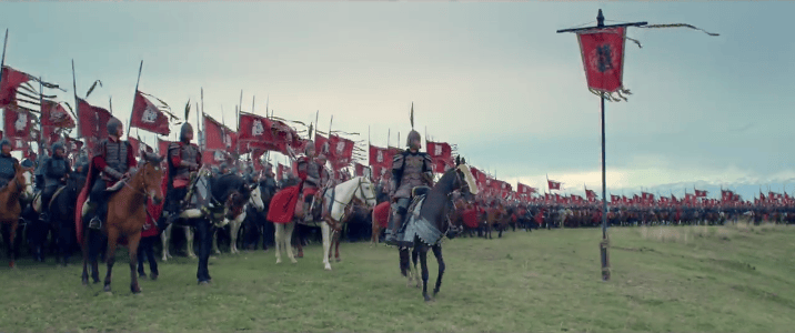 预告片刚开始草原上金戈铁马的场面非常壮观,目测至少有数百位群演。电影主要元素是西汉对抗匈奴,这意味着会有大量马战,像这样的战争场面应该会有很多,大银幕上看挺爽的。