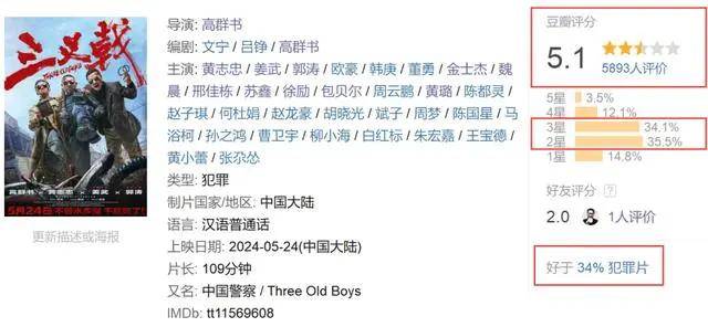 目前,《三叉戟》豆瓣5.1分,打两星的人最多,却显示好于34%的犯罪片,真是票房口碑一起扑街!