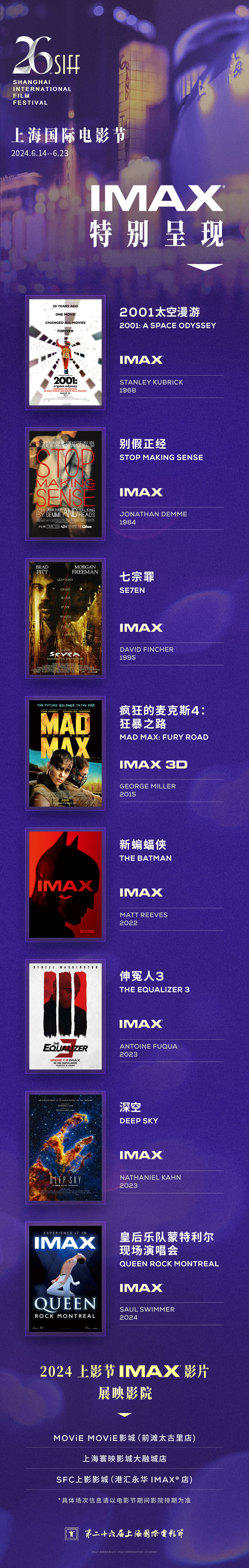 参与本次IMAX展映的电影作品题材类型丰富多元,艺术性与观赏性兼具。留名影史的经典科幻电影《2001太空漫游》将震撼呈现宏伟太空史诗,于IMAX的超大银幕和沉浸环境中再现电影大师斯坦利·库布里克的恣肆畅想。频频入选最伟大摇滚电影榜单的《别假正经》再现著名的传声头乐队的代表演出,将经由IMAX视听体验彰显光影与音乐结合的魅力。由大卫·芬奇执导的《七宗罪》作为惊悚悬疑电影经典之作,将带观众沉浸式走进错综复杂的罪案迷宫。《疯狂的麦克斯:狂暴之路》一经问世就以史诗式的视听语言惊艳观众并斩获奥斯卡六项大奖,通过IMAX大银幕带观众重回绝美而残酷的狂野大漠,走进为生存而战的末日传奇。电影《波西米亚狂想曲》曾荣膺奥斯卡四项大奖,IMAX观众将再次感受皇后乐队的经典名曲。广受赞誉的超级英雄电影《新蝙蝠侠》是新一任蝙蝠侠的惊艳首秀,此次观众将可于IMAX再度领略其富于暗黑气质的银幕美学。犯罪动作影片《伸冤人3》是这一知名电影系列的终章,丹泽尔·华盛顿将“打”上IMAX大银幕,上演快意恩仇的正义之战。
