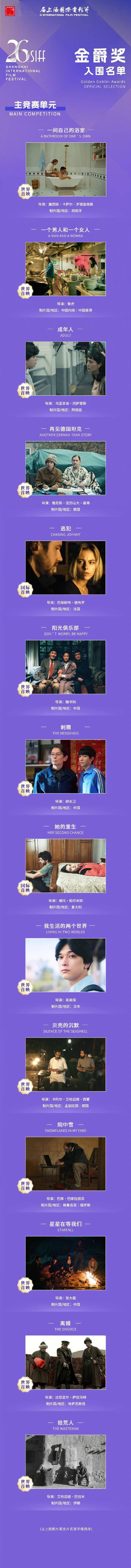 其余影片分别为《一间自己的浴室》《成年人》《再见德国坦克》《逃犯》《她的重生》《我生活的两个世界》《贝壳的沉默》《院中雪》《离婚》《拾荒人》(按影片英文片名首字母排序) 。