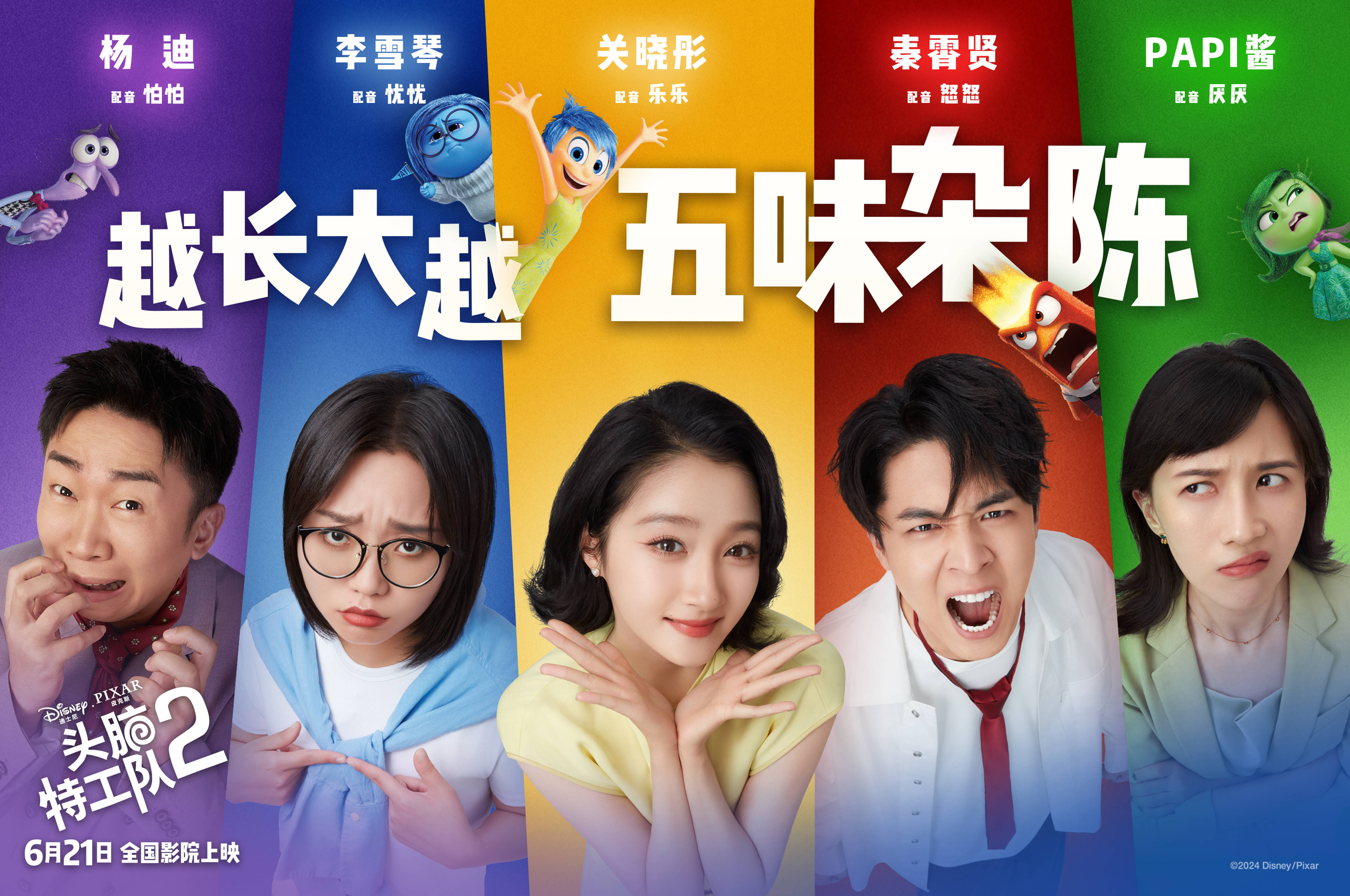 北京时间5月29日消息,由中影/华夏发行,迪士尼·皮克斯荣誉出品的动画新片《头脑特工队2》将于6月21日登录内地院线。影片中文配音阵容于今日公布,五位明星艺人将化身为五个奇特的情绪小人儿:当红演员关晓彤、李雪琴将分别为乐观向上的乐乐(Joy)和温柔细腻的忧忧(Sadness)配音;