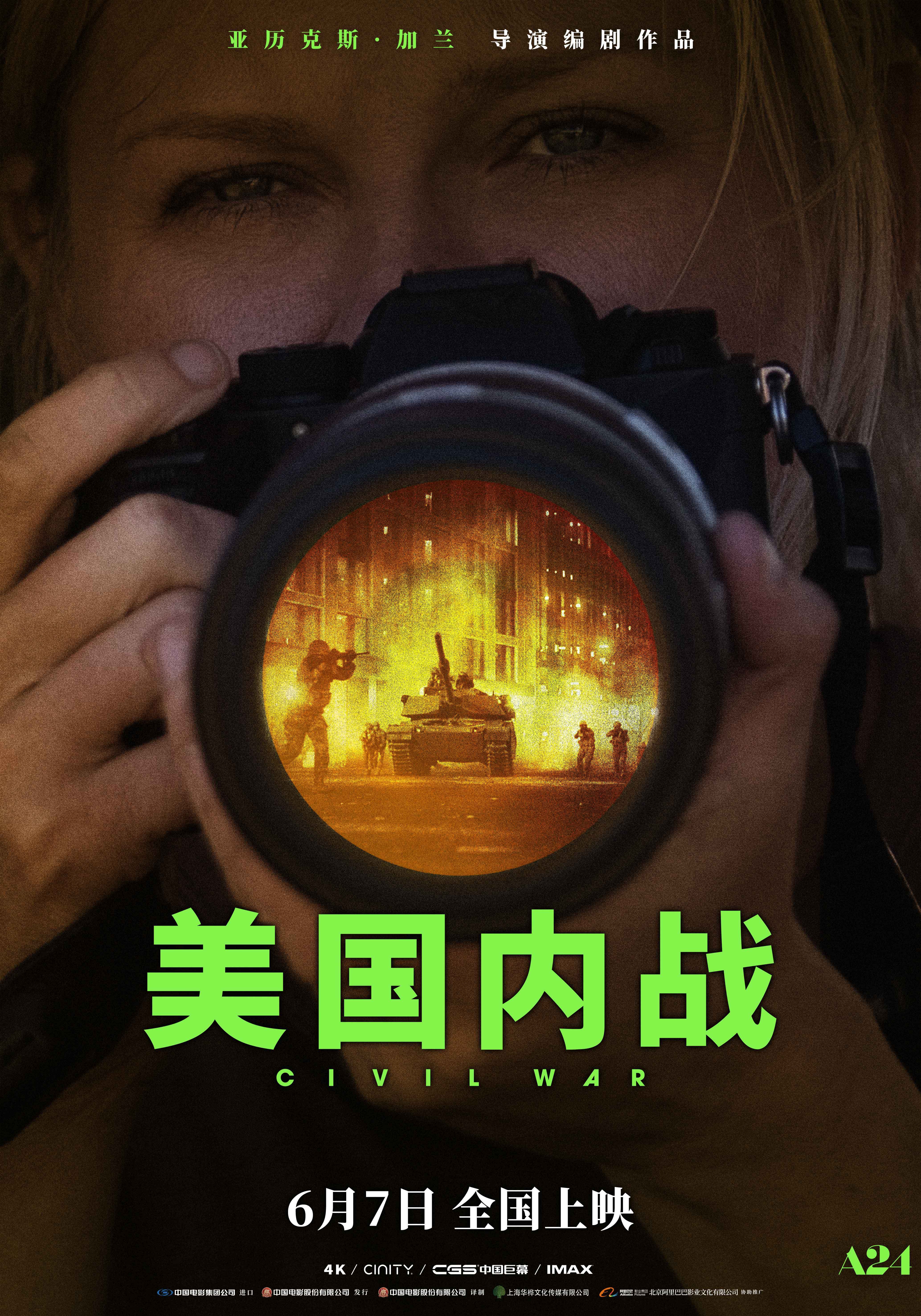 随着“一线报道”版终极预告片的发布,克斯汀·邓斯特饰演的李等一行人的目的逐渐明确:内战中反对政府的武装正直逼华盛顿,企图捉拿并击毙总统,而身为记者的主角团必须赶在这之前前往白宫采访总统、拿到第一手新闻。为此,哪怕明知一路战火连绵、困难重重,甚至冒着生命危险,他们也毅然前行。而“见证历史”版终极海报上,李的镜头记录下士兵们举枪战斗、火焰吞噬战场的危机时刻,与之形成对照的则是其眼神中的困惑、悲悯以及一丝对于内战未知结局的迷茫。几个记者在前往白宫途中究竟经历了什么?内战的最终走向又将如何?一切答案都将在电影《美国内战》中揭晓。