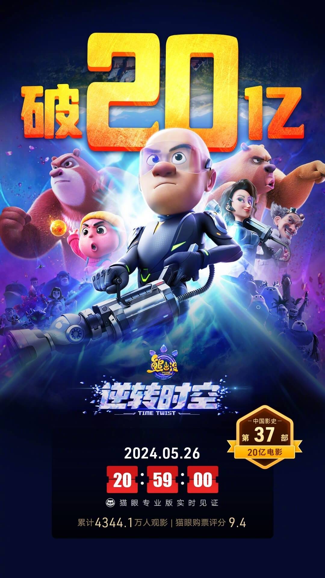 搜狐娱乐讯 据猫眼专业版数据,“熊出没”系列第十部大电影《熊出没·逆转时空》上映第107天 ,总票房破20亿。暂居2024年度内地电影票房榜第4位。