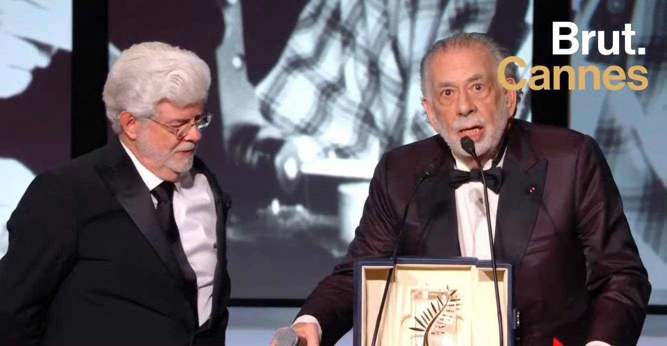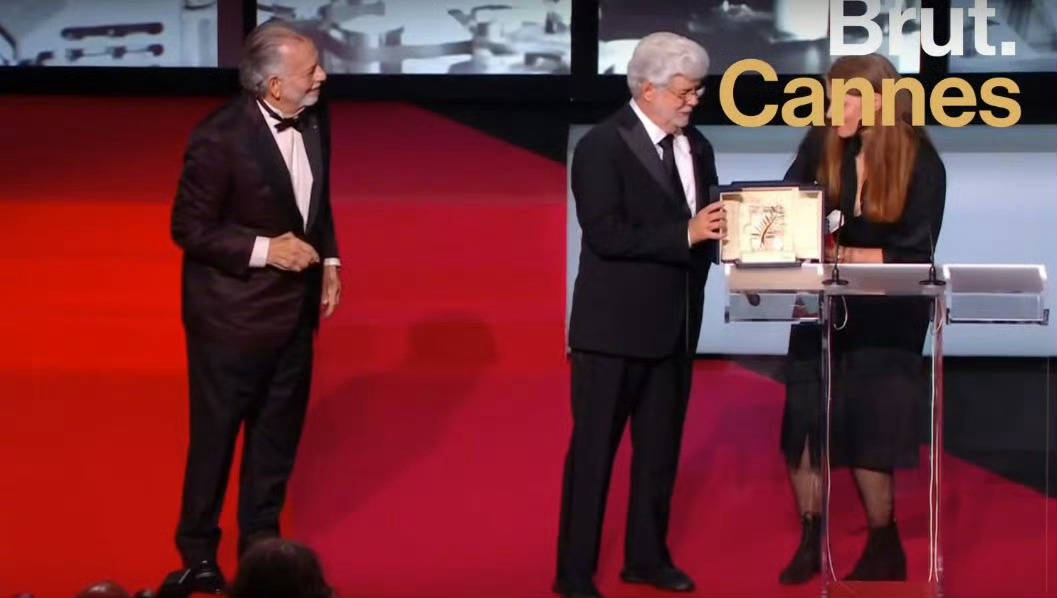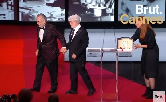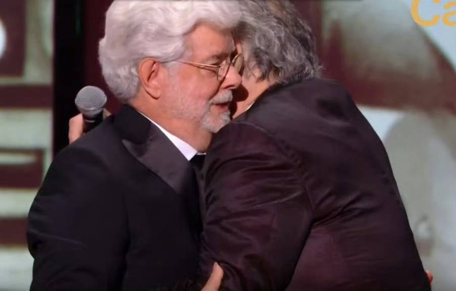 搜狐娱乐讯 80岁的好莱坞名导乔治·卢卡斯获颁第77届戛纳电影节荣誉金棕榈(终身成就奖),有作品入围但没获奖的老友弗朗西斯·福特·科波拉赶回来为他颁奖。