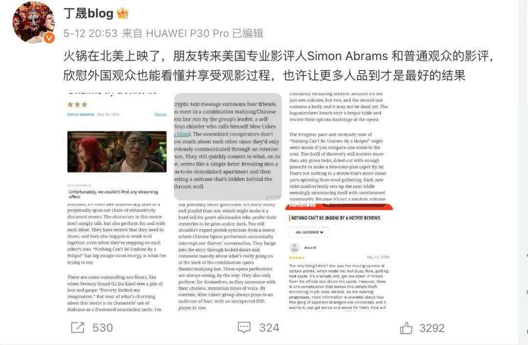 没想到导演又发了一条微博,称“朋友转来美国专业影评人Simon Abrams 和普通观众的影评,欣慰外国观众也能看懂并享受观影过程,也许让更多人品到才是最好的结果 ”。