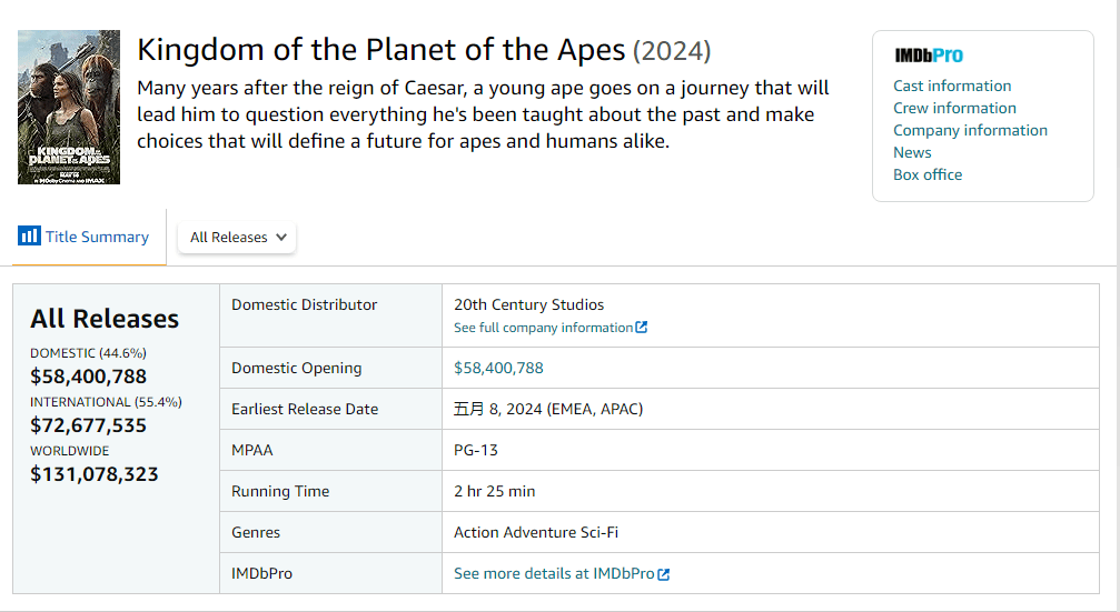 搜狐娱乐讯 “猩球崛起”系列第四部电影《猩球崛起:新世界》北美首周三天票房报收5840万美元,表现上佳;北美之外首周7267.75万美元,其中中国内地约1125.9万美元(约合人民币8165万),全球票房累计1.31亿美元,为该系列最佳全球开画成绩。